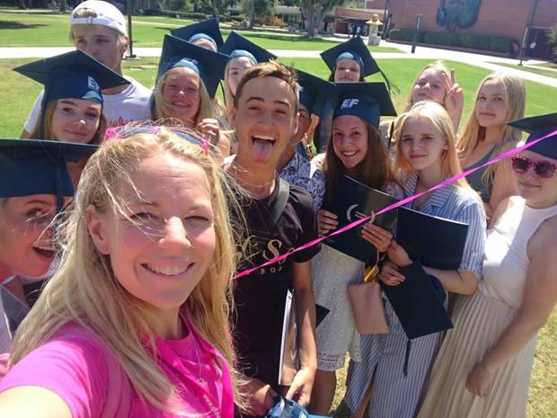Noen veldig aktive studenter liker å løpe seg en tur om morningen, men de fleste av oss vil heller sove litt lengre. Personlig liker jeg å spise frokost tidlig når det ikke er så mye mennesker der og møter deretter studentene for aktiviteter, som normalt sett starter rundt 9. Aktivitetene kan enten være på campus som colorfest, pimp the leader, scavenger hunt osv eller så tar i våre gule skolebusser og drar på forskjellige utflukter som Hollywood Walk of Fame, Outlets on orange, Laguna Beach osv. Hvis vi har vært på morningaktivitet har studentene skole på ettermiddagen. Før de har skoletime spiser de lunch på campus. Når de er ferdig med timen trenger de å spise før kveldsaktiviteten! Middag er ikke inkludert i Long Beach så dette er virkelig tiden for Uber Eats! Det er så kult å se den lange linjen med biler som ruller opp mot campus med mat til studentene. Noen ganger på kvelden drar vi et sted, som på kino! Ellers blir vi på campus og har talentshow, filmkveld eller noe slikt. Normalt sett har vi noe fritid også her, men klokken 23:00 må alle være på rommene sine og gjøre seg klare for enda en spennende dag på språkreise.